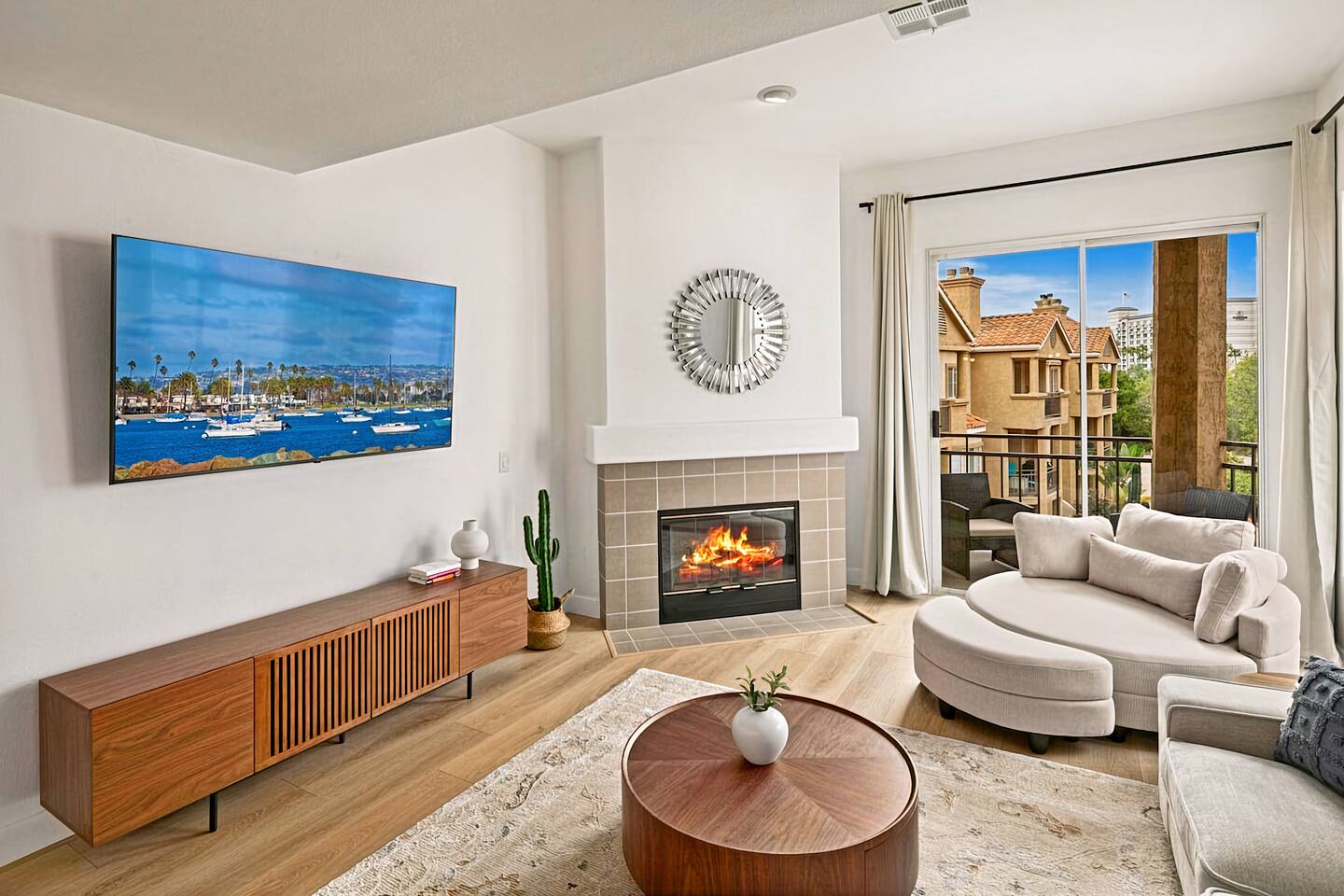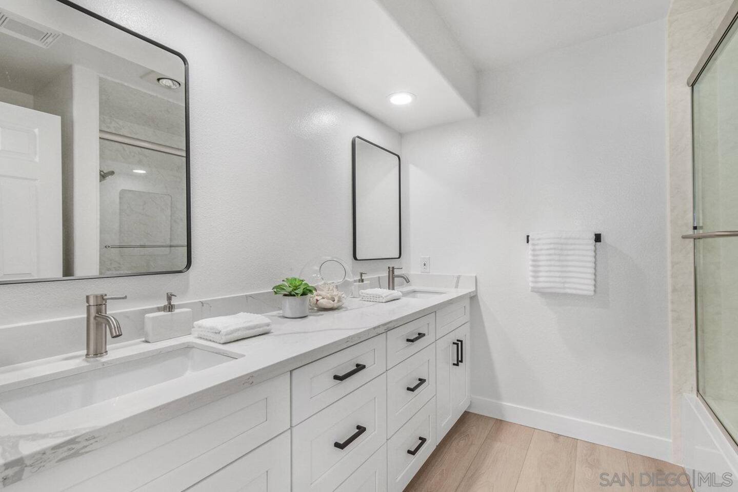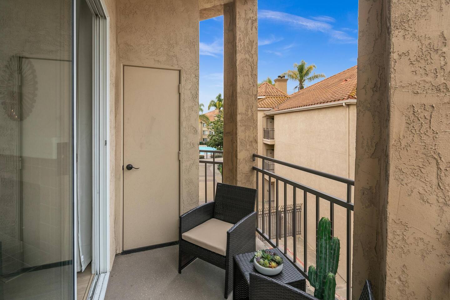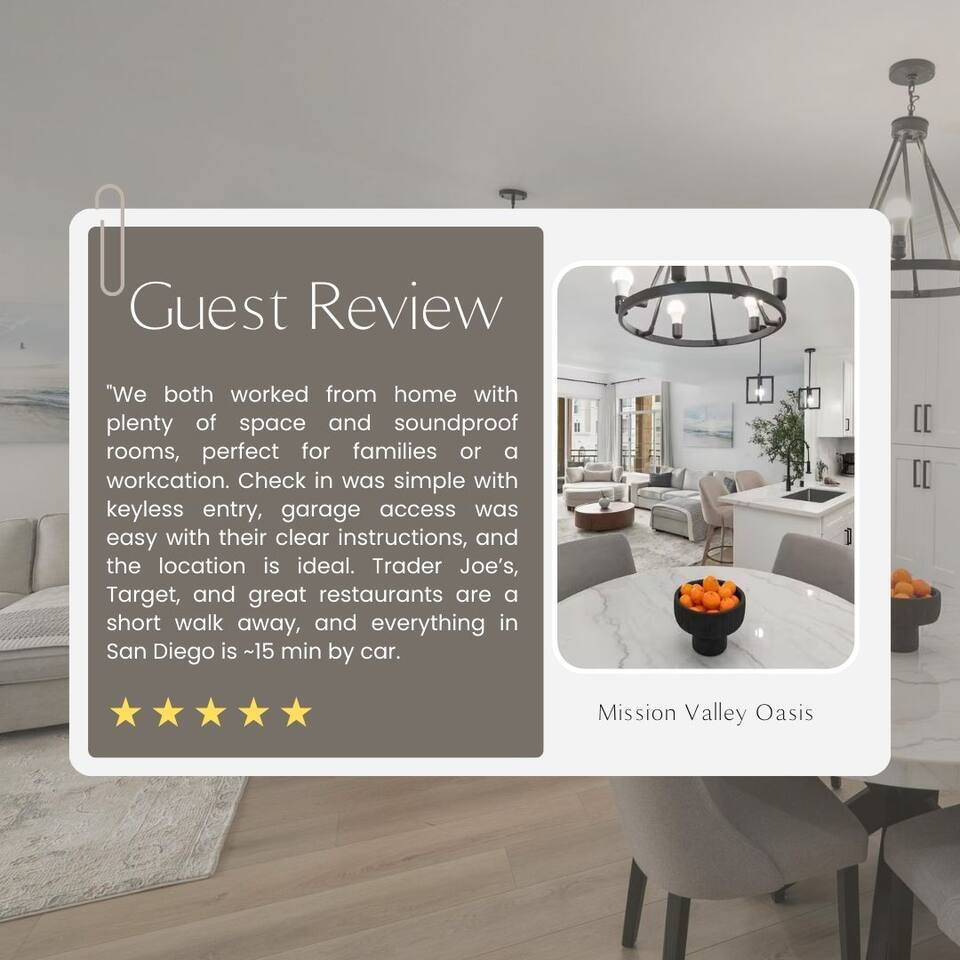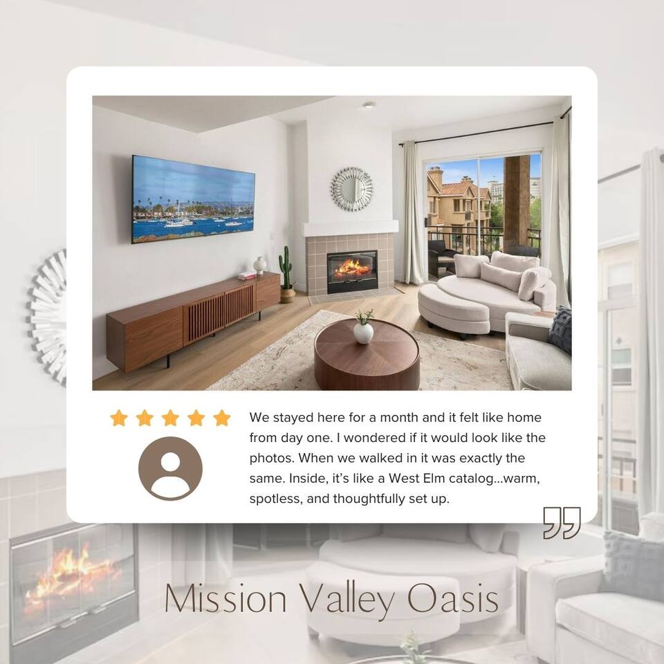 ☆☆ HIGHLIGHTS ☆☆ ✹ Top 3rd-floor corner unit condo in a secure gated community ✹ Sleeps 5 ✹ 2 spacious bedrooms w/ DreamCloud mattresses; 1 king, 1 queen with twin trundle ✹ 2 full bathrooms w/ sleek finishes ✹ Full kitchen w/ modern appliances ✹ Complimentary coffee bar ✹ Spacious living area w/ a flat-screen smart TV + comfy couches ✹ Fireplace ✹ High-speed wifi + dedicated workspace ✹ Private balcony ✹ In-unit washer + dryer ✹ Central A/C ✹ Secure parking onsite ✹ Access to pool, hot tub + fitness center ✹ Prime location in a quiet neighborhood w/ easy access to public transportation, grocery stores, Fashion Valley & Mission Valley Malls, freeways, beaches + more ★★ BEDROOMS ★★ The spacious and bright primary suite offers a cozy reprieve after a long day of work or exploring. Sink into the plush DreamCloud mattress, let your worries melt away, and enjoy a restful night every night. The guest bedroom has an equally comfy mattress, plus a twin trundle for additional sleeping space. ✹Primary Suite: King-sized bed, ensuite bathroom, flat-screen smart TV, dedicated workspace ✹Bedroom 2: Queen-sized bed + twin trundle ✔ DreamCloud mattresses ✔ Blackout curtains ✔ High-quality linens ✔ Ample closet space ★★ BATHROOMS ★★ Enjoy the spa-like full bathroom attached to the primary bedroom, complete with stylish quartz finishes and ample storage space. There is an extra full bath located off the main living space, giving the whole group convenient access to bathroom facilities. ✹Bathroom 1: Ensuite to the primary bedroom with quartz finishes, dual sinks, and a shower/tub combo ✹Bathroom 2: Guest bath with a shower/tub combo ✔ Hair dryer ✔ Fresh towels ✔ Washer + dryer ★★ KITCHEN & DINING ★★ The fully stocked kitchen will have you feeling right at home with modern appliances, an open layout, and a cozy dining nook. You’ll find everything you need to whip up delicious meals. Start your mornings off by brewing a hot coffee and enjoying it out on the private balcony. When you’re not in the mood to cook, there are plenty of great restaurants nearby. ✔ Fully stocked kitchen w/ stainless steel appliances ✔ Coffee bar ✔ Basic cookware & dinnerware ✔ Dining nook w/ seating for 4 + bar seating for 2 ★★ LIVING ROOM ★★ Kick your feet up and relax in the bright and airy living room. Floor-to-ceiling windows let in plenty of natural light, offering the perfect spot to relax. Choose a spot on one of the comfy sofas, flip on the gas fireplace for some ambiance, and enjoy your favorite programs on the flat-screen smart TV. ✔ Open concept ✔ Fireplace ✔ Comfortable seating ✔ Flat-screen smart TV ★★ OUTDOOR SPACE ★★ Step out to the private balcony to enjoy a morning coffee in the fresh air, or soak up the famous Southern California sunshine from the resort-style pool and sun deck. There’s even a hot tub for relaxing and rejuvenating sore muscles after enjoying the local trails. ✔ Private balcony off the living room ✔ Access to community pool and hot tub ✔ Trail for walking, running and biking ★★ COMMUNITY ACCESS ★★ In addition to the private condo, guests will also have access to all the community amenities, including the outdoor pool and hot tub, a fitness center, and a local trail for walking, running, and biking. This easy access to modern amenities that help you maintain your fitness routines makes our property a great place for long-term stays! ✔ Gated complex for added security ✔ Resort-style pool and hot tub ✔ Fully-equipped fitness center ✔ Direct access to trails for walking, running, and biking ★★ ACTIVITIES/ATTRACTIONS ★★ Once you’re ready to venture outside the gated community, you’ll find every convenience just a short drive from home. Whether you’re looking for a work-friendly cafe, top attractions, or a bite to eat, you won’t have far to go. ✔ Work-Friendly Cafés & Productive Spaces Quiet cafés, co-working spots, and inspiring work environments nearby: • Spill the Beans Coffee & Bagels – across the street • The Coffee Bean & Tea Leaf – 0.3 miles • Mimi’s Café – 0.4 miles • Mission Coworking – 0.9 miles • Regus Coworking – 1.2 miles ✔ Fitness, Wellness & Outdoor Recharge Peaceful parks, scenic paths, and energizing workouts for balance and wellness: • Balboa Park Trails & Gardens – 3.1 miles • San Diego River Trail ~ 1 mile • Mission Bay Park – 5.2 miles • Yoga Box Mission Valley – 3.4 miles • Presidio Park – 2.2 miles ✔ Culture & Creative Inspiration Museums, galleries, and local arts to spark ideas and unwind after work: • San Diego Museum of Art – 4 miles • The Old Globe Theatre – 4 miles • San Diego Natural History Museum – 4.2 miles • Centro Cultural de la Raza – 4.6 miles • North Park murals & art walks – 2.4 miles ✔ Transit & Access Quick access to public transit, airport routes, and major highways for smooth travel and daily commutes: • Fashion Valley Trolley Station – 0.6 miles • San Diego International Airport (SAN) – 6.3 miles • Old Town Transit Center (Amtrak & Coaster) – 2.8 miles • I-8 & I-805 freeway access – 2.1 miles • Mission Valley Center Transit Hub – 1.1 mile ✔ Shopping Conveniently located near grocery stores, retail shops, and malls for all your essentials and leisure shopping. • Fashion Valley Mall – 0.4 miles • Mission Valley Mall – 0.8 miles • Trader Joe’s – 0.4 miles • Ralph’s – 1.4 miles • Target – 0.8 miles ✔ Dining Enjoy a variety of nearby restaurants, from quick bites to local favorites, all within walking distance or a short drive. • Gravity Heights – across the street • King’s Fish House – 0.3 miles • Panini Kabob Grill – 0.4 miles • Mimi’s Café – 0.4 miles • And many more within a short walk or drive All these activities and more are within your reach when you book with us