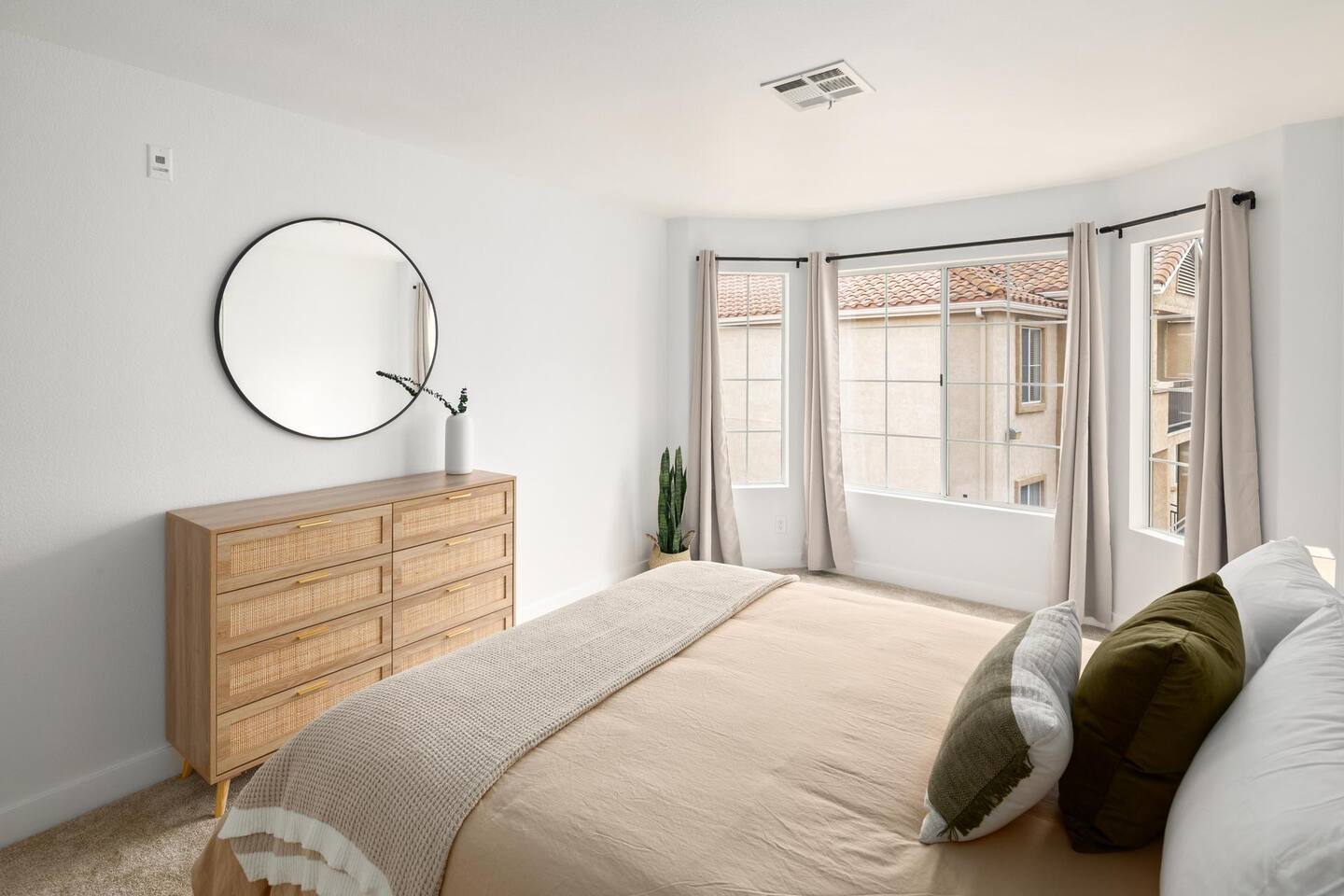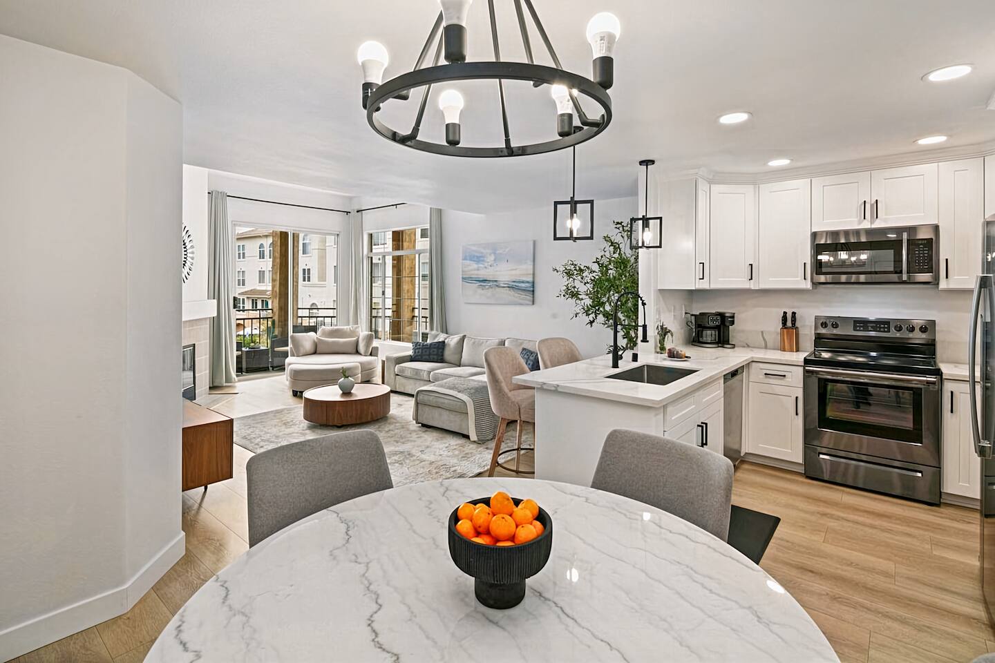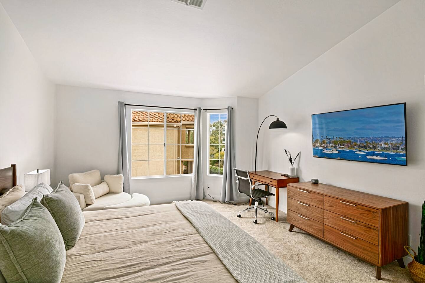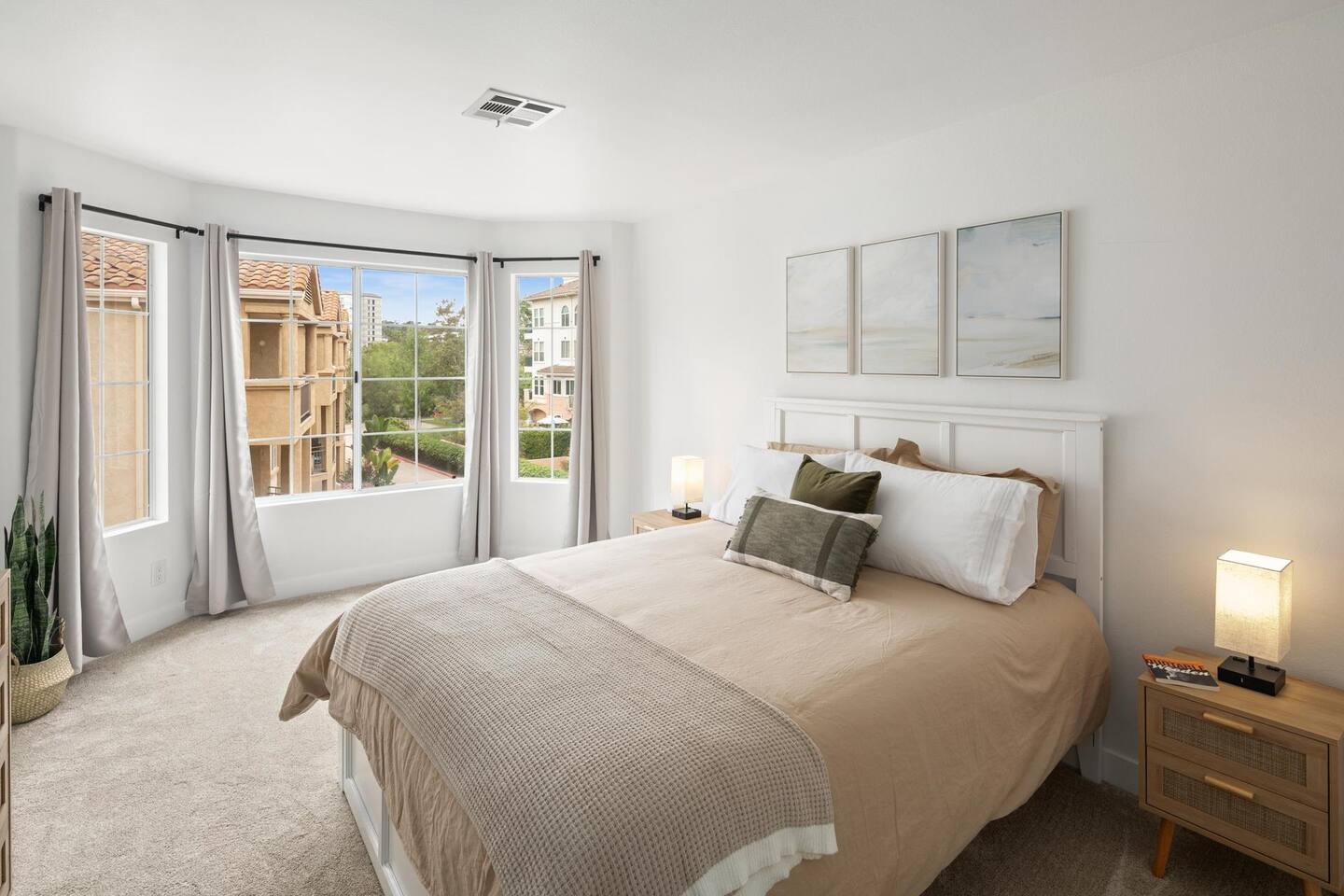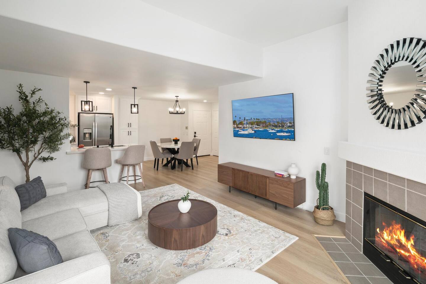 ☆☆ HIGHLIGHTS ☆☆ ✹ Top 3rd-floor corner unit condo in a secure gated community ✹ Sleeps 5 ✹ 2 spacious bedrooms w/ DreamCloud mattresses; 1 king, 1 queen with twin trundle ✹ 2 full bathrooms w/ sleek finishes ✹ Full kitchen w/ modern appliances ✹ Complimentary coffee bar ✹ Spacious living area w/ a flat-screen smart TV + comfy couches ✹ Fireplace ✹ High-speed wifi + dedicated workspace ✹ Private balcony ✹ In-unit washer + dryer ✹ Central A/C ✹ Secure parking onsite ✹ Access to pool, hot tub + fitness center ✹ Prime location in a quiet neighborhood w/ easy access to public transportation, grocery stores, Fashion Valley & Mission Valley Malls, freeways, beaches + more ★★ BEDROOMS ★★ The spacious and bright primary suite offers a cozy reprieve after a long day of work or exploring. Sink into the plush DreamCloud mattress, let your worries melt away, and enjoy a restful night every night. The guest bedroom has an equally comfy mattress, plus a twin trundle for additional sleeping space. ✹Primary Suite: King-sized bed, ensuite bathroom, flat-screen smart TV, dedicated workspace ✹Bedroom 2: Queen-sized bed + twin trundle ✔ DreamCloud mattresses ✔ Blackout curtains ✔ High-quality linens ✔ Ample closet space ★★ BATHROOMS ★★ Enjoy the spa-like full bathroom attached to the primary bedroom, complete with stylish quartz finishes and ample storage space. There is an extra full bath located off the main living space, giving the whole group convenient access to bathroom facilities. ✹Bathroom 1: Ensuite to the primary bedroom with quartz finishes, dual sinks, and a shower/tub combo ✹Bathroom 2: Guest bath with a shower/tub combo ✔ Hair dryer ✔ Fresh towels ✔ Washer + dryer ★★ KITCHEN & DINING ★★ The fully stocked kitchen will have you feeling right at home with modern appliances, an open layout, and a cozy dining nook. You’ll find everything you need to whip up delicious meals. Start your mornings off by brewing a hot coffee and enjoying it out on the private balcony. When you’re not in the mood to cook, there are plenty of great restaurants nearby. ✔ Fully stocked kitchen w/ stainless steel appliances ✔ Coffee bar ✔ Basic cookware & dinnerware ✔ Dining nook w/ seating for 4 + bar seating for 2 ★★ LIVING ROOM ★★ Kick your feet up and relax in the bright and airy living room. Floor-to-ceiling windows let in plenty of natural light, offering the perfect spot to relax. Choose a spot on one of the comfy sofas, flip on the gas fireplace for some ambiance, and enjoy your favorite programs on the flat-screen smart TV. ✔ Open concept ✔ Fireplace ✔ Comfortable seating ✔ Flat-screen smart TV ★★ OUTDOOR SPACE ★★ Step out to the private balcony to enjoy a morning coffee in the fresh air, or soak up the famous Southern California sunshine from the resort-style pool and sun deck. There’s even a hot tub for relaxing and rejuvenating sore muscles after enjoying the local trails. ✔ Private balcony off the living room ✔ Access to community pool and hot tub ✔ Trail for walking, running and biking ★★ COMMUNITY ACCESS ★★ In addition to the private condo, guests will also have access to all the community amenities, including the outdoor pool and hot tub, a fitness center, and a local trail for walking, running, and biking. This easy access to modern amenities that help you maintain your fitness routines makes our property a great place for long-term stays! ✔ Gated complex for added security ✔ Resort-style pool and hot tub ✔ Fully-equipped fitness center ✔ Direct access to trails for walking, running, and biking ★★ ACTIVITIES/ATTRACTIONS ★★ Once you’re ready to venture outside the gated community, you’ll find every convenience just a short drive from home. Whether you’re looking for a work-friendly cafe, top attractions, or a bite to eat, you won’t have far to go. ✔ Work-Friendly Cafés & Productive Spaces Quiet cafés, co-working spots, and inspiring work environments nearby: • Spill the Beans Coffee & Bagels – across the street • The Coffee Bean & Tea Leaf – 0.3 miles • Mimi’s Café – 0.4 miles • Mission Coworking – 0.9 miles • Regus Coworking – 1.2 miles ✔ Fitness, Wellness & Outdoor Recharge Peaceful parks, scenic paths, and energizing workouts for balance and wellness: • Balboa Park Trails & Gardens – 3.1 miles • San Diego River Trail ~ 1 mile • Mission Bay Park – 5.2 miles • Yoga Box Mission Valley – 3.4 miles • Presidio Park – 2.2 miles ✔ Culture & Creative Inspiration Museums, galleries, and local arts to spark ideas and unwind after work: • San Diego Museum of Art – 4 miles • The Old Globe Theatre – 4 miles • San Diego Natural History Museum – 4.2 miles • Centro Cultural de la Raza – 4.6 miles • North Park murals & art walks – 2.4 miles ✔ Transit & Access Quick access to public transit, airport routes, and major highways for smooth travel and daily commutes: • Fashion Valley Trolley Station – 0.6 miles • San Diego International Airport (SAN) – 6.3 miles • Old Town Transit Center (Amtrak & Coaster) – 2.8 miles • I-8 & I-805 freeway access – 2.1 miles • Mission Valley Center Transit Hub – 1.1 mile ✔ Shopping Conveniently located near grocery stores, retail shops, and malls for all your essentials and leisure shopping. • Fashion Valley Mall – 0.4 miles • Mission Valley Mall – 0.8 miles • Trader Joe’s – 0.4 miles • Ralph’s – 1.4 miles • Target – 0.8 miles ✔ Dining Enjoy a variety of nearby restaurants, from quick bites to local favorites, all within walking distance or a short drive. • Gravity Heights – across the street • King’s Fish House – 0.3 miles • Panini Kabob Grill – 0.4 miles • Mimi’s Café – 0.4 miles • And many more within a short walk or drive All these activities and more are within your reach when you book with us